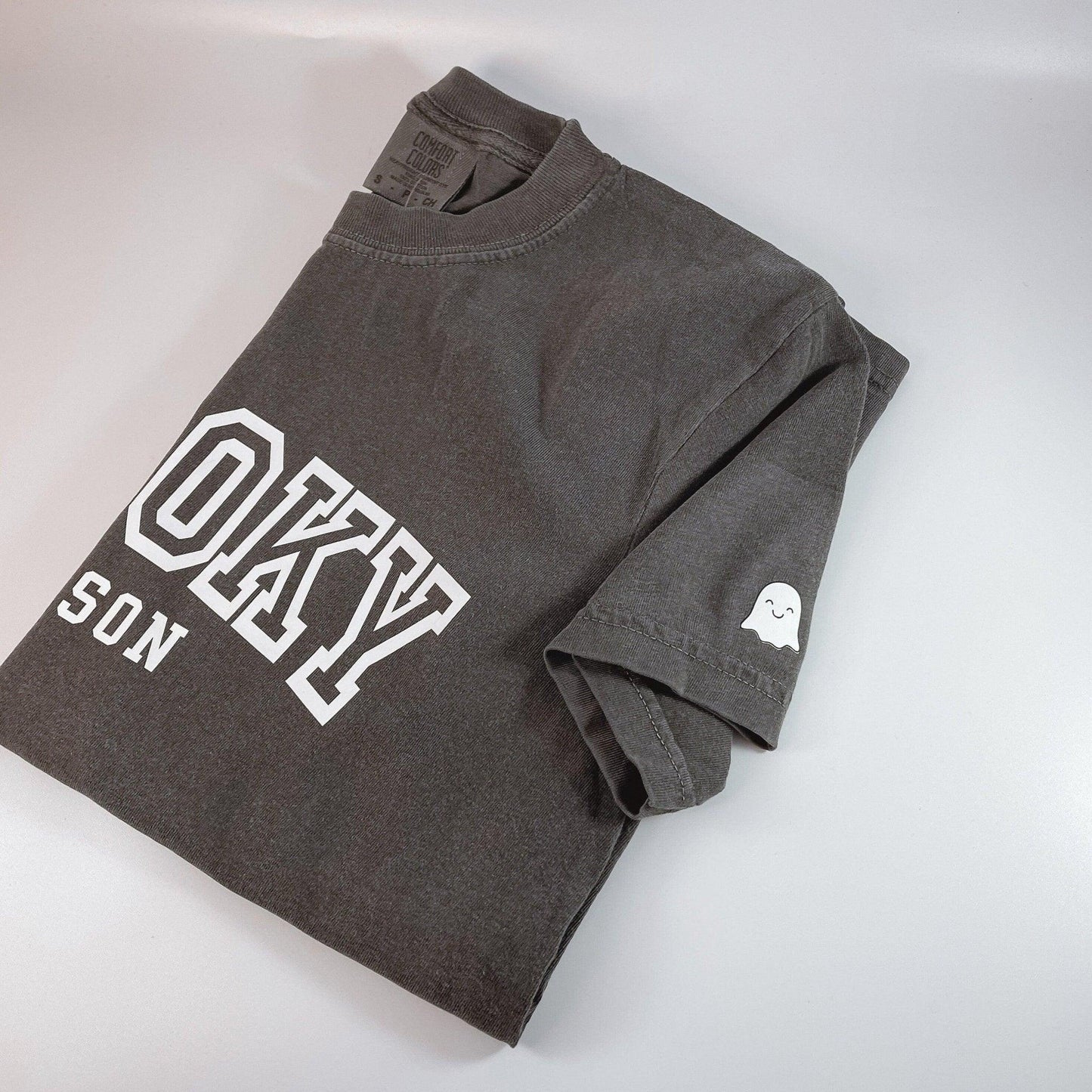 Spooky Season - varsity style! With the cutest little ghostie on the left sleeve!